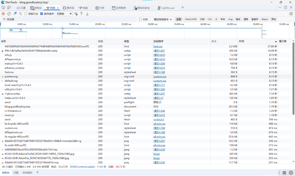GoodBoyboy老师的博客其实页面显示得挺快的,但是估计被一些非核心功能拖慢了,花了49.73s转圈圈。还有字体和图片文件可以再压缩一下,目前看起来还是比较大的体积。部分资源等待服务器响应占用的时间比较长,可能是网络问题?